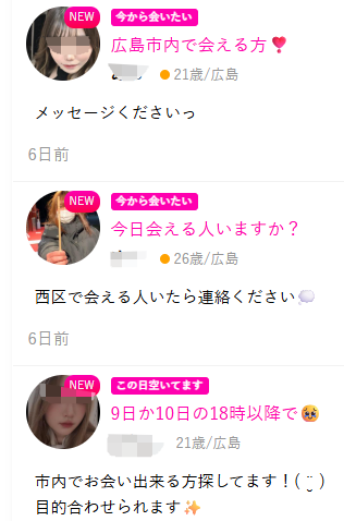 地域検索や掲示板機能の使い勝手がよく、流川や八丁堀といった観光客の多いスポットでは特にマッチング成功率が上がります。
